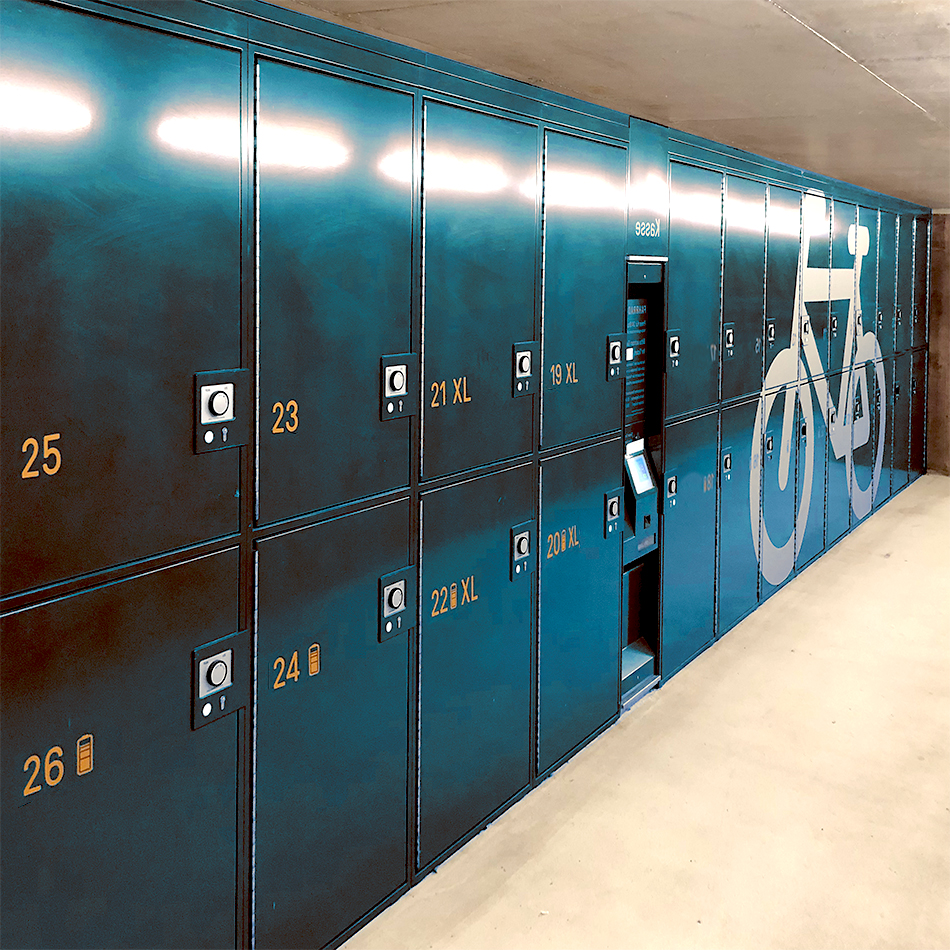 Fietskluis geschakeld is een professionele oplossing door ons ontwikkeld voor de publieke ruimte, VVE’s, fietsverhuurders, vakantieparken, verenigingen ( B2B) etc. waar een individuele fietskluis per fiets gewenst is. De fietskluis kan volledig geautomatiseerd geleverd worden of manueel bedienbaar per toegangsdeur. De inzet van onze fietskluizen is legio en telkens verbazen wij ons over nieuwe toepassingen die men op dit systeem bedenkt. In de bovenste laag is een etagerek geïnstalleerd welke manueel naar buiten te trekken is en naar beneden scharniert met hydraulische veer.