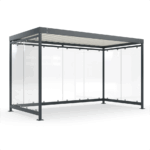 Thermisch verzinkte stalen constructie, met weerbestendig damwand plaatstalen dak, leverbaar in verschillende afmetingen, met optioneel te kiezen zijwanden en vooraf statisch getoetst type.